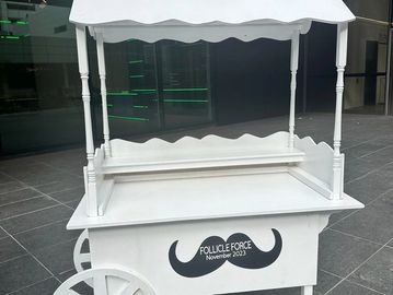 White cart rental with custom name and drape backdrop