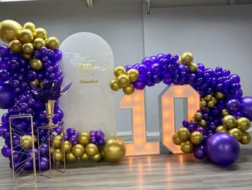 Package includes backdrop arch, balloon garland, 2 gold stands and 2 marquee letters
