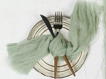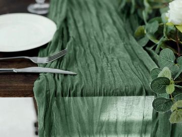 Unique cheesecloth runners and napkins to decorate your table. Available in 3 different colours!